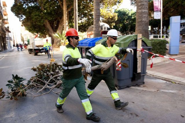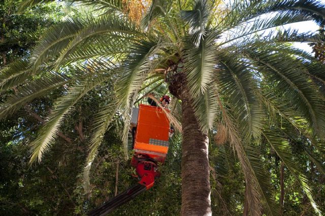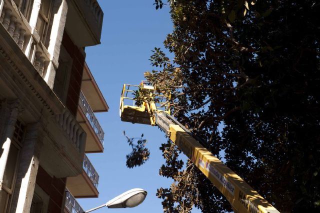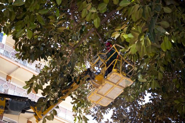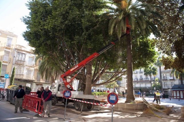 Las brigadas del Servicio de Parques y Jardines del Ayuntamiento de Cartagena han iniciado esta mañana a la poda de los ficus y palmeras que pueblan la plaza de San Francisco, concretamente la mitad de la plaza, ya que mañana martes proseguirán su actuación en la otra mitad.
