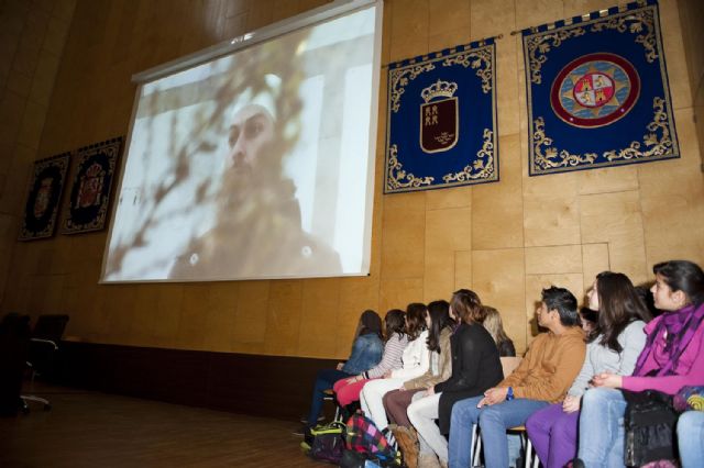 Acompañado de la concejal de Juventud, Ruth Collado y del profesor, Juan de Dios, ha llegado esta mañana al Paraninfo de la UPCT el autor de Tanta gente sola dispuesto a no dar demasiadas pistas de su libro, sino más bien a escuchar a los más de 600 estudiantes que se han congregado en el Salón de Actos.