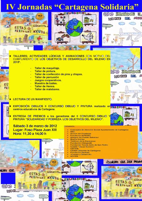 La IV edición Jornadas Cartagena Solidaria, que organiza el Instituto Municipal de Servicios Sociales junto a las ONGs del municipio, será el sábado 3 de marzo en la plaza de Juan XXIII.