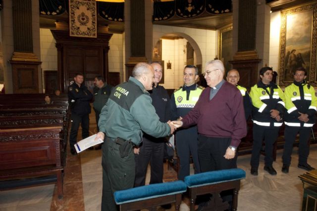 Agentes de la Policía Local, Nacional y de la Guardia Civil, encabezados por sus máximos representantes, Manuel Asensio, Alfonso Navarro y José Antonio Muñoz, han asistido esta mañana al cambio de corona de la Virgen.