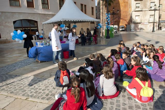 La plaza del Ayuntamiento se ha convertido esta mañana en un laboratorio del agua. Mesas, tubos de ensayo, cubos, jarras, algo de agua y científicos acompañados por centenares de pequeños aprendices. Durante toda la mañana han realizado experimentos con un objetivo muy concreto: concienciar a los más pequeños de la escasez de este bien y de la importancia de valorar el agua.