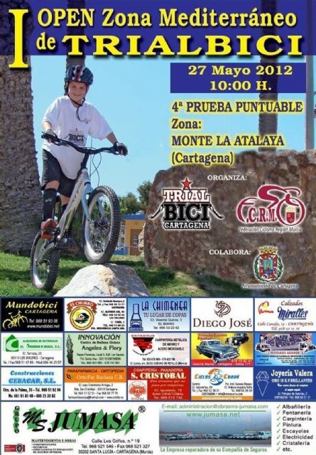 El próximo domingo, día 27 de mayo, se celebra en el Monte La Atalaya de Cartagena la cuarta y última prueba del I Open Zona Mediterráneo de Trialbici, organizada por el Club Trialbici Cartagena en colaboración de la Federación Murciana de Ciclismo, el Ayuntamiento de Cartagena y diversos patrocinadores.