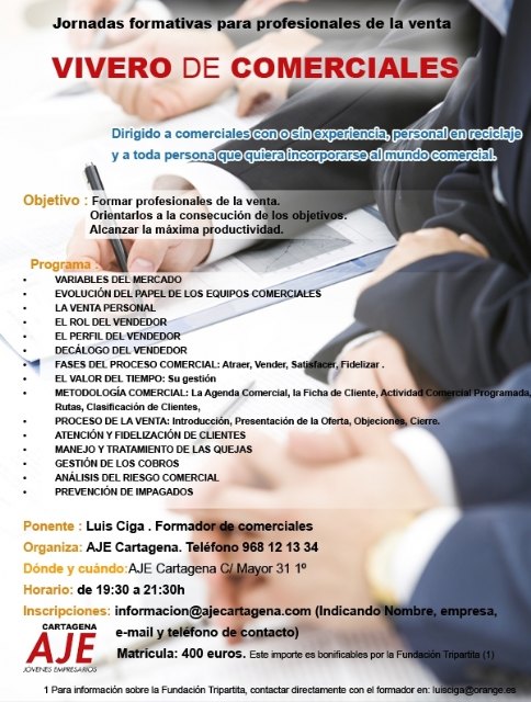 Durante el pasado mes de abril se puso en marcha en la Asociación de Jóvenes Empresarios de Cartagena y su Comarca (AJE), el servicio permanente conocido como “Vivero de Comerciales” que, coordinado por el formador Luis Ciga, tiene como objeto formar a trabajadores del sector comercial, siendo las empresas Exclusivas Carthago y Molkar Trading las dos primeras en hacer uso de este servicio con éxito, lo que les supone una ventaja competitiva a la hora de trabajar con los clientes.