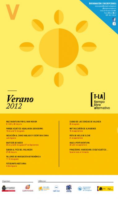 Las actividades empezarán en julio y se prolongarán hasta final de septiembre. Entre ellas destacan una ruta en bicicleta, piragua y senderismo por el Mar Menor, visitas al parque acuático de Aqualandia, un viaje a Port Aventura, bautizos y cursos de buceo, rafting por el Cañón de Almadenes, patinaje en la pista de hielo de Elche y talleres de Navegación Astronómica, entre otros.