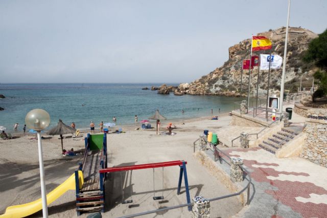 La alcaldesa ha izado esta mañana uno de los distintivos, el concedido a la playa urbana de Cala Cortina, que mantienen a Cartagena como el municipio español con más emblemas de este tipo otorgados por el ICTE