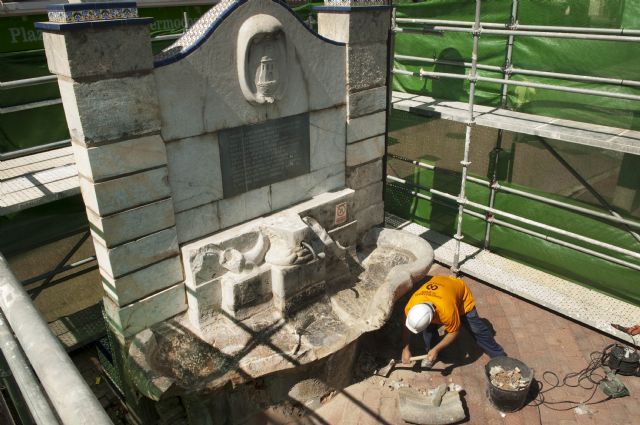 Por ahora, el equipo que se encarga de la restauración está limpiando la zona que se desprendió del monumento y eliminando los añadidos de la fuente para proceder posteriormente a su restauración.