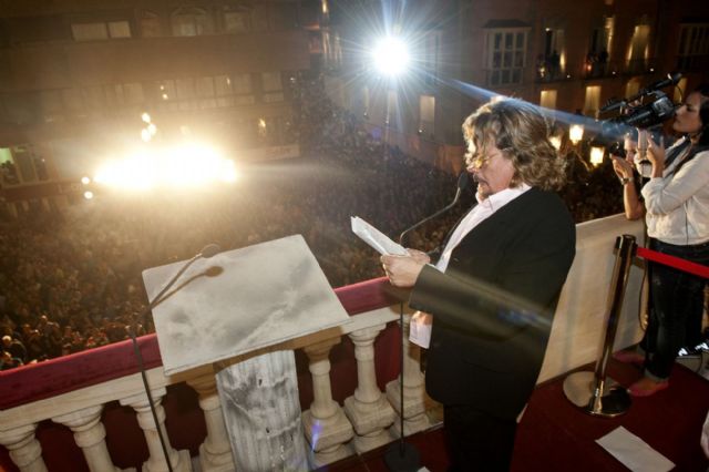 Eran las noche y la plaza del Ayuntamiento estaba a rebosar. Miles de cartageneros se han congregado frente al Palacio Consistorial para poder ver en persona y escuchar al cómico Juan Muñoz, pregonero de la XXIII edición de las fiestas de Carthagineses y Romanos, más conocido por ser la voz del ogro Shrek y ex de Cruz y Raya.