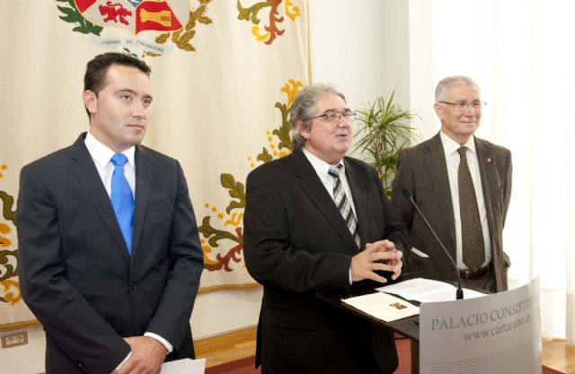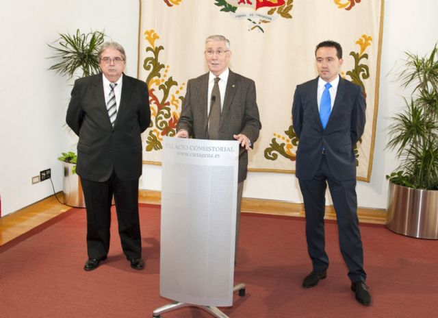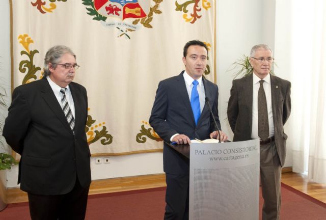 El Ayuntamiento de Cartagena ha sido elegido como anfitrión para la presentación de los actos de hermanamiento entre la Cofradía de Pescadores y la Agrupación del Jesús Nazareno de La Unión, que se celebrarán el domingo 18 de noviembre y han presentado hoy el concejal de Atención Social, Antonio Calderón, el concejal de Turismo y Seguridad de La Unión, Antonio Liarte, y el presidente del Nazareno del municipio vecino, José Cortado.