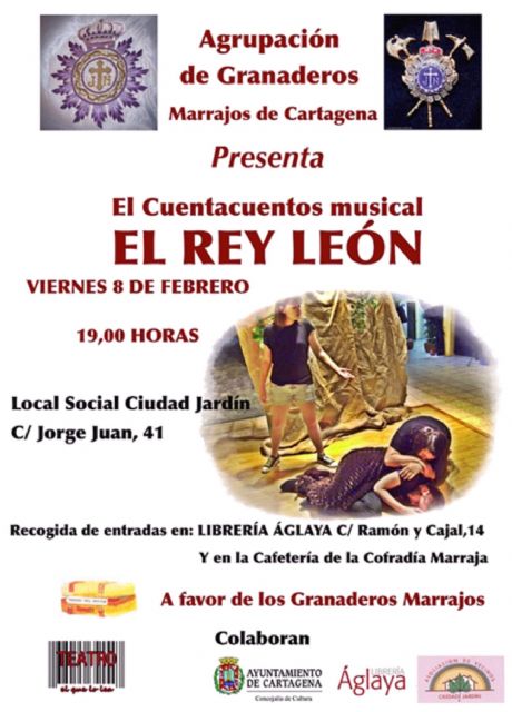 Las asociaciones culturales Teatro del Desván y Teatro el que lo lea, con la colaboración de la Concejalía de Cultura, actuarán el día 8 de febrero a favor de los Granaderos Marrajos, poniendo en escena el cuentacuentos musical El Rey León.