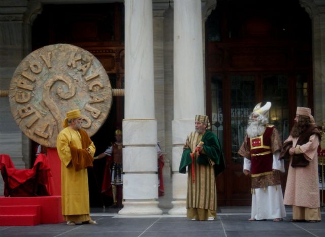 La Plaza del Ayuntamiento volverá a vivir como en otras ocasiones la escenificación del Drama del Pretorio, obra del autor Ãngel Joaquín García Bravo. A modo de pórtico romano, la fachada principal del Palacio Consistorial será esta tarde, a partir de las 17,45 horas, el escenario en el que se representará el Lavatorio de Pilatos.