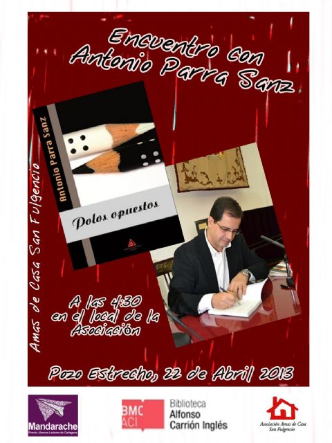 El autor Antonio Parra Sanz, visitará el lunes 22 de abril el local de la Asociación de Amas de Casa San Fulgencio de Pozo Estrecho, para hablar de su libro Polos Opuestos, encuentro que tendrá lugar a las 16,30 horas y cuenta con la colaboración de la Concejalía de la Mujer.