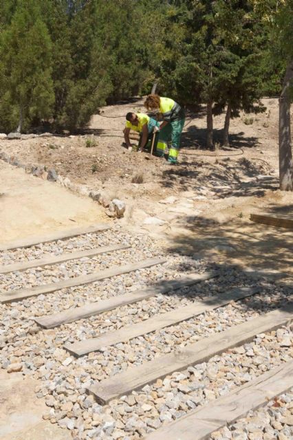 Lo que se ha puesto en práctica es una alternativa a la pavimentación con materiales impermeables, que consiste en revegetar taludes con planta autóctona, en sintonía con la naturaleza de la zona, y la consolidación de suelos, delimitando caminos en los que se mezcla árido semipermeable, terrazo y traviesas de madera.