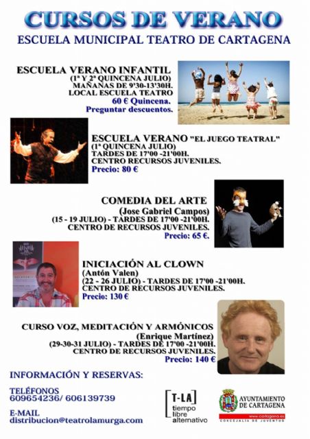 En colaboración con el Ayuntamiento de Cartagena, el Programa T-LA (Tiempo Libre y Alternativo) de la Concejalía de Juventud y La Murga Teatro, la Escuela Municipal de Teatro Francisco Rabal de Cartagena propone para el mes de julio una serie de cursos de verano para todas las edades con objeto de seguir disfrutando del teatro.