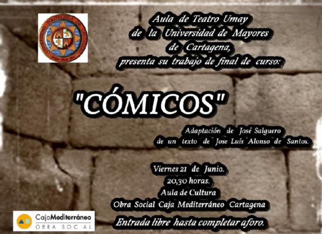El aula de teatro Umay de la Universidad de Mayores de la Universidad Politécnica de Cartagena cerrará este viernes 21 de junio su curso teatral con la representación de la obra, Cómicos. Dirigido por José Salguero, este curso forma parte de los ya integrados en la programación anual de este aula, y se desarrolla con el objeto de fomentar el interés por el teatro y mejorar la dinámica fisiológica de los participantes.