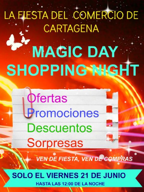 Bajo el reclamo publicitario de Magic Day, Shopping Night, en esta primera fiesta comercial los establecimientos permanecerán abiertos hasta las doce de la noche, según ha explicado el concejal de Comercio, Mariano García, quien ha resaltado que esta nueva actividad servirá para dinamizar el sector comercial de Cartagena. Así, además de comprar y beneficiarse del primer adelanto de las rebajas con descuentos de hasta el 50%, a lo largo del viernes también se podrá disfrutar de la multitud de actividades paralelas que hay previstas y que invitan a los cartageneros y turistas a salir a la calle.