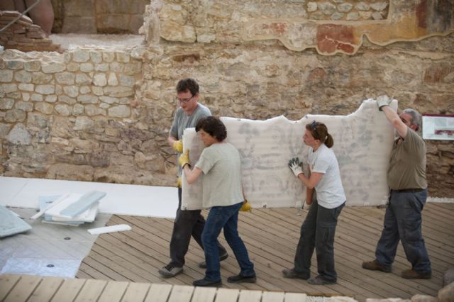 Estas pinturas, una vez catalogadas y estudiadas, se han sometido a un proceso de restauración que ha comprendido su limpieza, consolidación y montaje del correspondiente puzzle, gracias al cual se ha determinado la posición exacta de los fragmentos en su pared. Así, se ha realizado la restitución de tres paños de pintura mural pertenecientes a dos habitaciones diferentes.