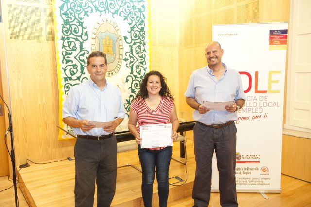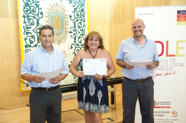 El concejal de Empleo, Diego Ortega, y el director de la Agencia de Desarrollo Local y Empleo de Cartagena, Francisco Valenzuela, han entregado este mediodía en la Sala de Ceremonias del Palacio Consistorial los diplomas acreditativos a los alumnos de dos de los cursos impartidos por la Agencia: Celador Sanitario y Conducción Subacuática e Iniciación al Buceo Deportivo.
