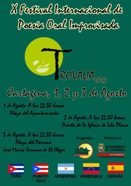 Troveros, payadores, repentistas y trovadores de primer orden recalarán en Cartagena, desde mañana jueves 1 de agosto hasta el sábado 3 de agosto, para compartir sus mejores letras con los representantes de España. Las veladas poéticas comenzarán a las 22,30 horas en tres escenarios diferentes: Plaza del Ayuntamiento (jueves 1 de agosto); Puerta de la Iglesia de Isla Plana (viernes 2 de agosto); y Plaza del Párroco José María Serrano de El Algar (sábado 3 de agosto).
