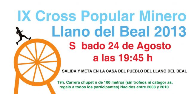 Con 7 kilómetros por caminos de tierra y parajes mineros de los alrededores, y 700 metros por asfalto, el IX Cross Popular Minero de El Llano del Beal se presenta como un original circuito con un desnivel acumulado de 114 metros. Este cross partirá este sábado 24 de agosto a las 19,45 horas teniendo como punto de salida y meta el mismo escenario: la Casa del Pueblo del Llano del Beal.