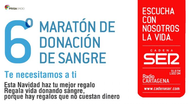 Un año más, por estas fechas navideñas, arranca la VI Maratón de Donación de Sangre en Cartagena, con el lema SER solidarios, el próximo jueves 19 de diciembre en la planta baja del Palacio Consistorial. Se trata de una iniciativa solidaria en la que el objetivo es recaudar la mayor cantidad de sangre posible para estos días y que se encuentra organizada por la cadena SER, la Consejería de Sanidad, el Ayuntamiento de Cartagena, el Servicio Murciano de Salud y el Centro Regional de Hemodonación.
