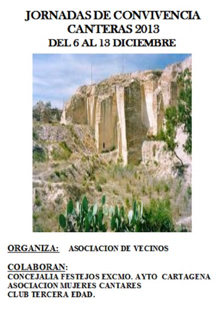 La diputación de Canteras celebra estos días unas Jornadas de Convivencia, que incluyen toda una serie de actividades culturales organizadas por la Asociación de Vecinos con la colaboración de la Asociación de Mujeres Cantares, el Club de la Tercera Edad y la Concejalía de Festejos del Ayuntamiento de Cartagena.