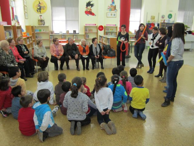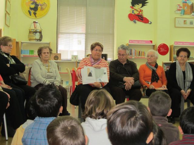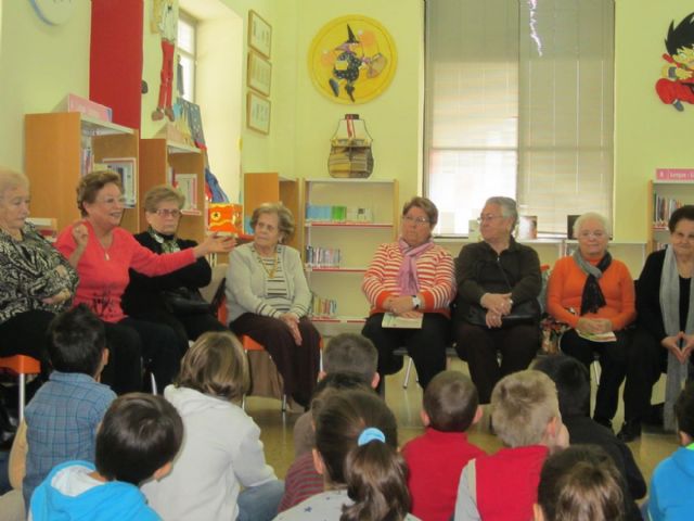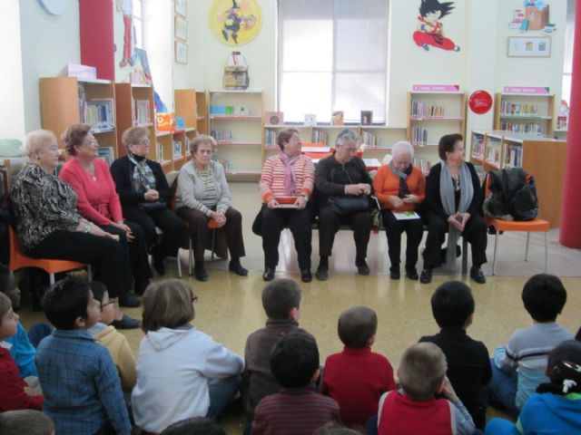 Niños y grandes. Tanto unos como otros estaban invitados este lunes a participar en un encuentro muy emotivo y especial en la Biblioteca del Centro Cultural Ramón Alonso Luzzy de Cartagena. Los mayores del Club del Sector Estación y de la Barriada Santiago se entremezclaban con los alumnos de primero de primaria del colegio Mastia que también asistían a este evento de Los mayores también cuentan.