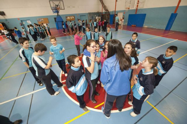 Varios miembros de la plantilla del Club UPCT Basket Cartagena, tanto jugadores como entrenadores, han enseñado a los alumnos de 5° y 6° de Primaria de este centro unos cuántos trucos para jugar al baloncesto. Los niños recibían a los deportistas con pancartas que ellos mismos habían diseñado esta semana en clase.