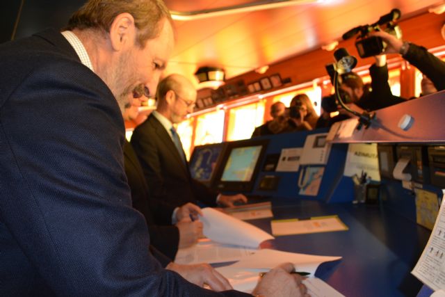 El rector de la UPCT, José Antonio Franco, y el director de Salvamento Marítimo, Juan Luis Pedrosa, han firmado el acuerdo a bordo del buque de rescate Clara Campoamor, en el puerto de Cartagena, durante un acto al que también ha asistido el consejero de Educación, Universidades y Empleo, Pedro Antonio Sánchez.