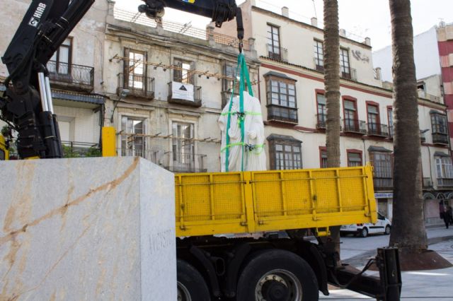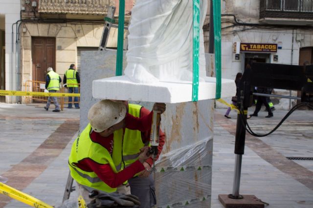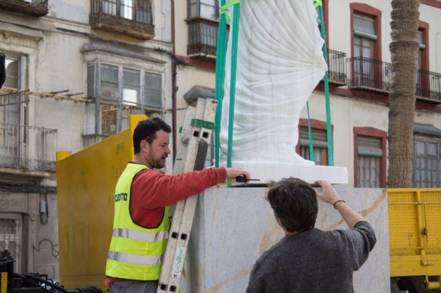 Este mediodía se ha instalado en la plaza de san Francisco una reproducción en mármol blanco de la estatua de Augusto hallada a escasos metros en las inmediaciones del Molinete. Con ello el Ayuntamiento trata de incorporar referencias romanas en los espacios más significativos de la antigua Cartagonova, como era su foro romano.