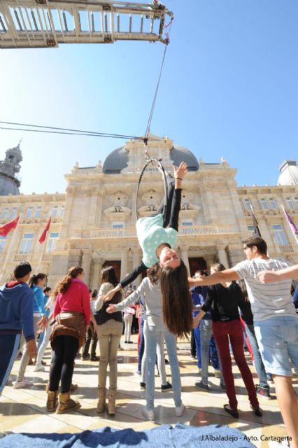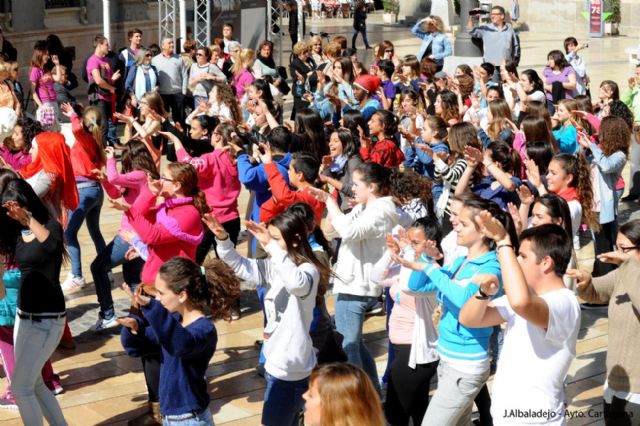 La nota de este acto la daban un grupo de estudiantes de varios institutos que amenizaban la lectura del manifiesto con un flashmob. Decenas de chavales salían a la improvisada pista de baile de la Plaza del Ayuntamiento para marcarse una coreografía que meses antes ya habían puesto en práctica en este recinto. Incluso una de las alumnas hacía acrobacias subida en una plataforma que los bomberos habían instalado para la ocasión.