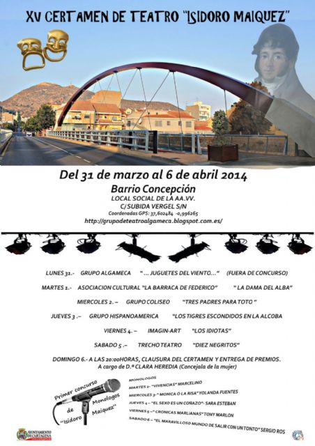 Vuelve un año más el XV Certamen de Teatro Isidoro Máiquez que se celebra en el Barrio de la Concepción por el grupo de mujeres Algameca, en colaboración con la Concejalía de Mujer del Ayuntamiento de cartagena. Será a partir del lunes próximo, 31 de marzo, cuando arranque este festival que estará durante una semana instalado en el escenario del local social de la Asociación de Vecinos, situado en la calle Subida Vergel.
