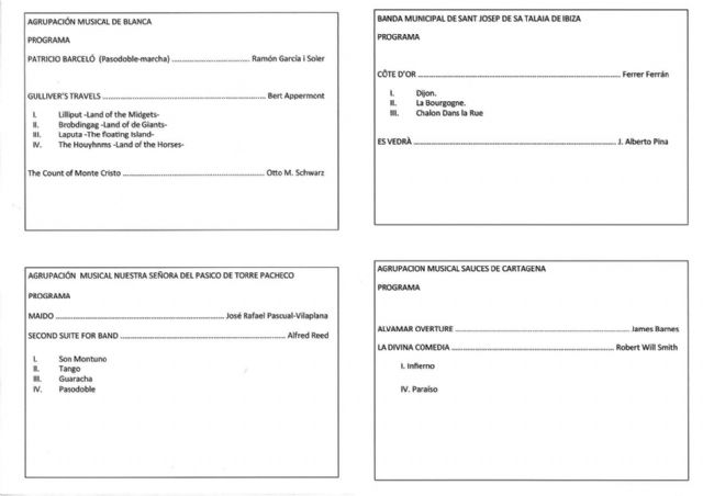 Un total de cuatro bandas musicales deleitarán al público asistente con una actuación en la que las ganas y la ilusión no faltan. Así, se subirán a este escenario la Agrupación Musical de Nuestra Señora del Pasico de Torre Pacheco, la Banda Municipal de Sant Joseph de sa Talaia de Ibiza, la Agrupación Musical de Blanca y la Agrupación anfitriona de Sauces.
