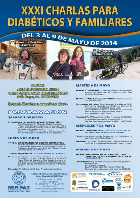 La Sociedad de Diabéticos de Cartagena y Comarca (SODICAR) organiza, en colaboración con el Ayuntamiento, las Charlas para Diabéticos y Familiares que ya tienen 31 años de vida. El Aula de Cultura de la Obra Social Caja Mediterráneo acogerá estas jornadas del 3 al 9 de mayo que se centran, sobre todo, en los buenos hábitos en la alimentación y el ejercicio.