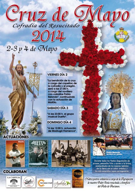 La inauguración será el próximo viernes 2 de mayo, a las 21 horas, que tras la bendición de la Cruz por D. Miguel Solana -Capellán de la Cofradía-, se pronunciará el pregón, que este año correrá a cargo de Pablo Belando, novillero con caballos murciano. El acto está presidido por el Hermano Mayor D. Tomás Martínez Pagán.