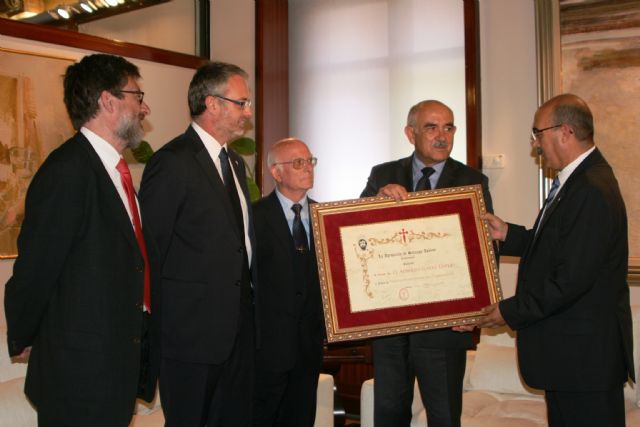 Alberto Garre recibió de manos del presidente de la Agrupación, Manuel Salmerón, un cuadro conmemorativo de esta distinción.