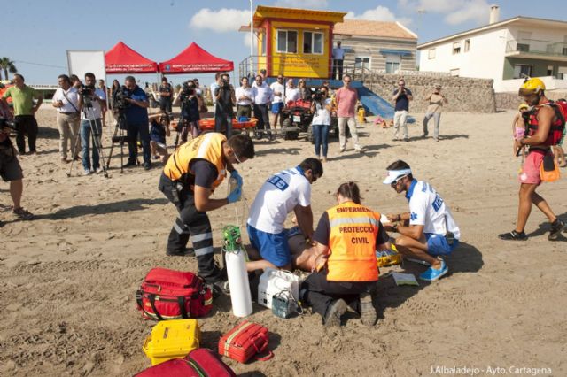 Los bañistas de esta playa cartagenera eran testigos además de un simulacro de rescate de cuatro bañistas, uno con síntomas de ahogamiento, que eran atendidos según el protocolo de Seguridad del Plan Copla. El objetivo de estas actuaciones es minimizar los riesgos en nuestras playas en verano y que las víctimas tengan una calidad asistencial en el menor tiempo posible, aclaraba hoy el coordinador de Protección Civil.