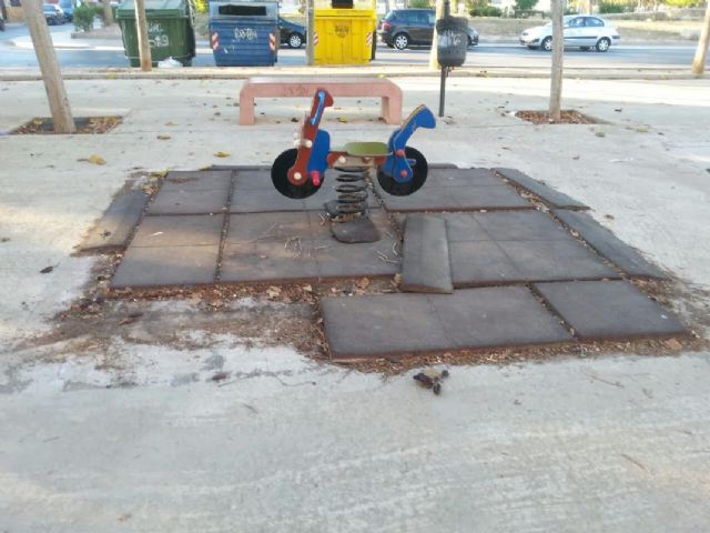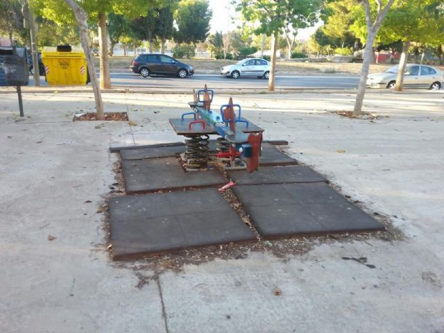 Además SPCT quiere poner de manifiesto, que la situación de deterioro de las zonas de juegos infantiles en el barrio no se limita al Parque Juan Carlos I, sino que también esta situación se da en la zona de juegos que hay frente a la farmacia del barrio, así la suciedad y el deterioro de la zona infantil es más que evidente. Corchos de seguridades desprendidas, muelles de los juegos sueltos, falta de limpieza, es la imagen que a diario contemplan con impotencia los vecinos del barrio.