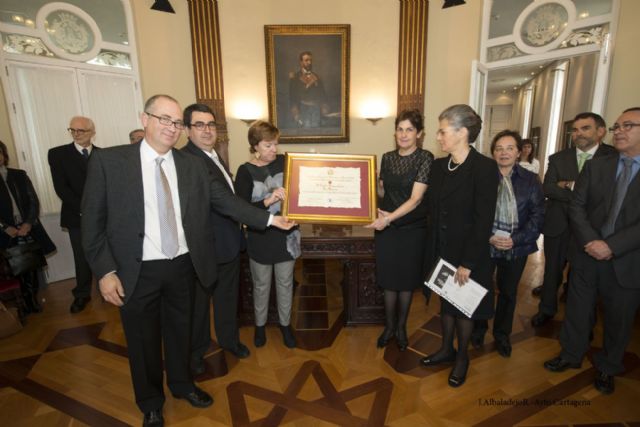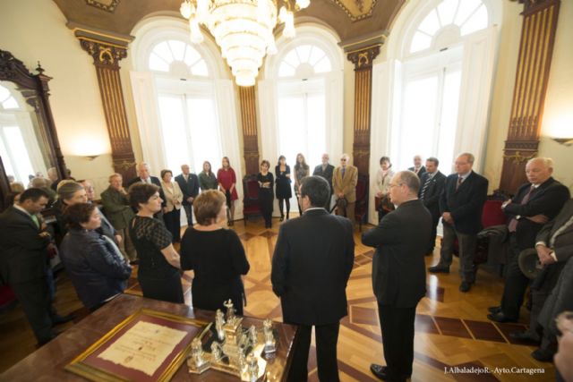 En un acto íntimo que se ha celebrado en la Alcaldía del Palacio Consistorial, la alcaldesa, Pilar Barreiro, ha entregado este mediodía el título de Hijo Adoptivo de Cartagena a los hijos de Joaquín Moreno Clavel, fallecido unos días antes de hacer efectivo este nombramiento, que aprobó el pleno de la Corporación el pasado 30 de septiembre.