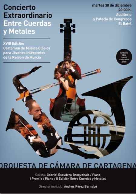 El Certamen regional de Música Clásica para Jóvenes Intérpretes Entre Cuerdas y Metales, que organizan la Concejalía de Juventud y el Conservatorio de Música de Cartagena, vuelve a presentar este año una nueva edición del ciclo de Conciertos Extraordinarios, con los que se recupera a antiguos premiados de este certamen que han consolidado su trayectoria y alcanzado el reconocimiento en sus carreras musicales, para tocar como solistas en conciertos realizados por la Orquesta de Cámara de Cartagena.