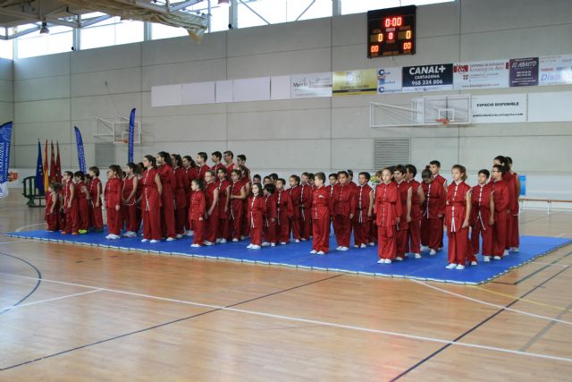 En torno a un centenar de chavales de entre 3 y 15 años participaron el pasado domingo en el I Festival de Wshu que se celebró en el Pabellón Cabezo Beaza, evento que contaba con la colaboración de la Concejalía de Deportes. En el mismo, pudieron realizar secuencias de movimientos y rutinas en diez modalidades diferentes como manejo de palo, sable, espada y defensa personal, entre otras.