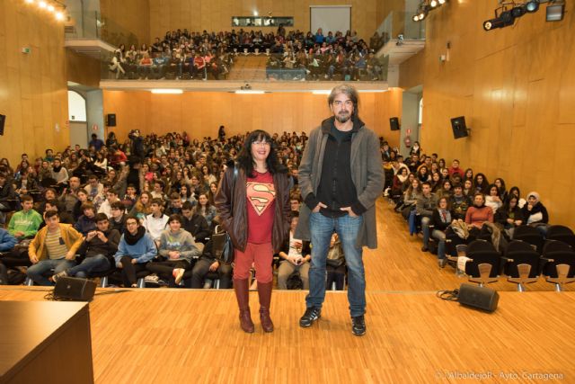 El director de cine y escritor ha estado acompañado esta mañana por la concejala de Juventud, Ruth Collado y su presentadora, María José Benítez, orientadora social del IES Las Salinas y miembro del Grupo Promotor del Premio.