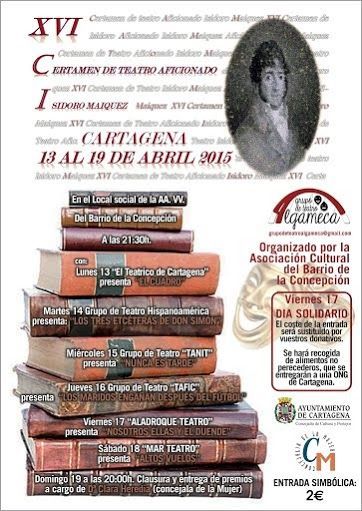 Lunes 13. El Teatrico de Cartagena: EL CUADRO.Martes 14. Grupo de Teatro Hispanoamérica: LOS TRES ECÉTERAS DE DON SIMÃ"N.Miércoles 15. Grupo de Teatro Tanit: NUNCA ES TARDE. Jueves 16. Grupo de Teatro Tafic: LOS MARIDOS ENGAÃ'AN DESPUÉS DEL FÚTBOL. Viernes 17. Aladroque teatro: NOSOTROS ELLAS Y EL DUENDE. Sábado 18. Mar Teatro: ALTOS VUELOS.