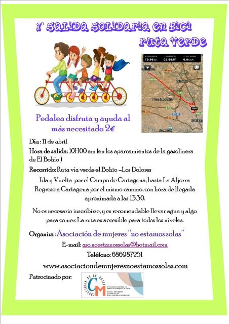 La Primera Salida Solidaria en Bici, organizado por la Asociación de Mujeres No Estamos Solas, tendrá lugar el 11 de abril a las 10.00 en los aparcamientos de la gasolinera de El Bohío, y con una hora de llegada estimada sobre la 13.30 horas.