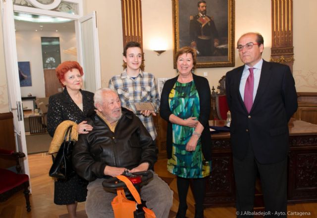 Gustavo Otón, el chaval de 13 años que salvó a sus abuelos en un incendio el pasado 22 de febrero en Cartagena, ha recibido hoy jueves un homenaje por parte de TECNIFUEGO-AESPI (Patronal española del sector de seguridad contra incendios), acto que se ha celebrado en el Palacio Consistorial, donde, acompañado por su familia, ha sido recibido por la alcaldesa, Pilar Barreiro, el concejal de Seguridad Ciudadana, Mariano García, y el jefe de Bomberos, Francisco Gómez Ávalos.