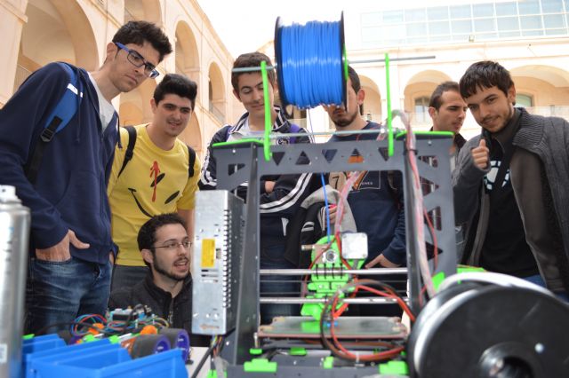 Estudiantes de la Universidad Politécnica de Cartagena de la asociación UPCT Makers han exhibido esta mañana en la Escuela de Industriales las impresoras 3D diseñadas y construidas por ellos mismos con las que participaron el pasado fin de semana en el evento nacional 3D Printer Party celebrado en León.