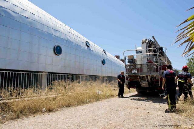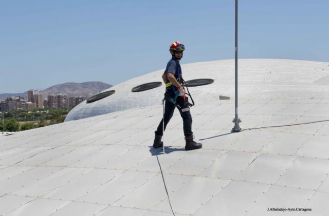 Bomberos del Servicio de Extinción de Incendios y Salvamento del Ayuntamiento de Cartagena (SEIS) retiraron ayer sábado un tramo de chapas que se habían levantado y amenazaban con desprenderse y caer a la vía pública por el viento del la cubierta del Palacio de Deportes.