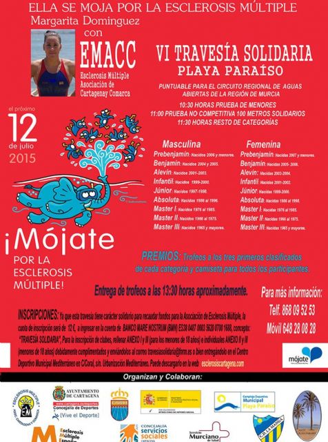 La Asociación de Esclerosis Múltiple de Cartagena y Comarca (EMACC) organiza la VI Travesía Solidaria del Mar Menor, que tendrá lugar el domingo 12 de julio, en horario de 10 a 13.30 horas en Playa Paraíso del Mar Menor, con la colaboración del Ayuntamiento de Cartagena.