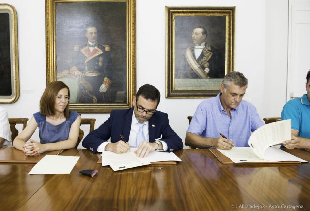 El alcalde, José López y el concejal del Área de Seguridad Ciudadana, Francisco Aznar han firmado el convenio con Trabajoscondron S.L, empresa encargada del proyecto pionero con el que se ha instaurado un dron en la Playa del Barco Perdido de Zeus, en Cartagena que complementará las labores de socorrismo de forma experimental. A la firma del convenio han asistido el responsable de la operadora, Fernando Delgado y el jefe de Bomberos, Francisco Gómez Ávalos.