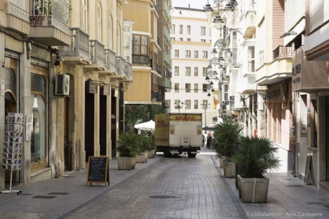 Agentes de la Policía Local de Cartagena destinados en el Casco Antiguo, controlan desde el lunes el peso de los vehículos que realizan operaciones de carga y descarga en las calles peatonales del centro de la ciudad.