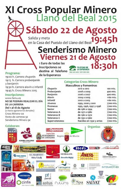 El Club Deportivo Minera, con la colaboración de la Concejalía de Deportes del Ayuntamiento de Cartagena y la Federación de Atletismo, organiza el XI Cross Popular Minero Llano del Beal 2015, que se va a celebrar el sábado 22 de agosto, a partir de las 19,45 horas.